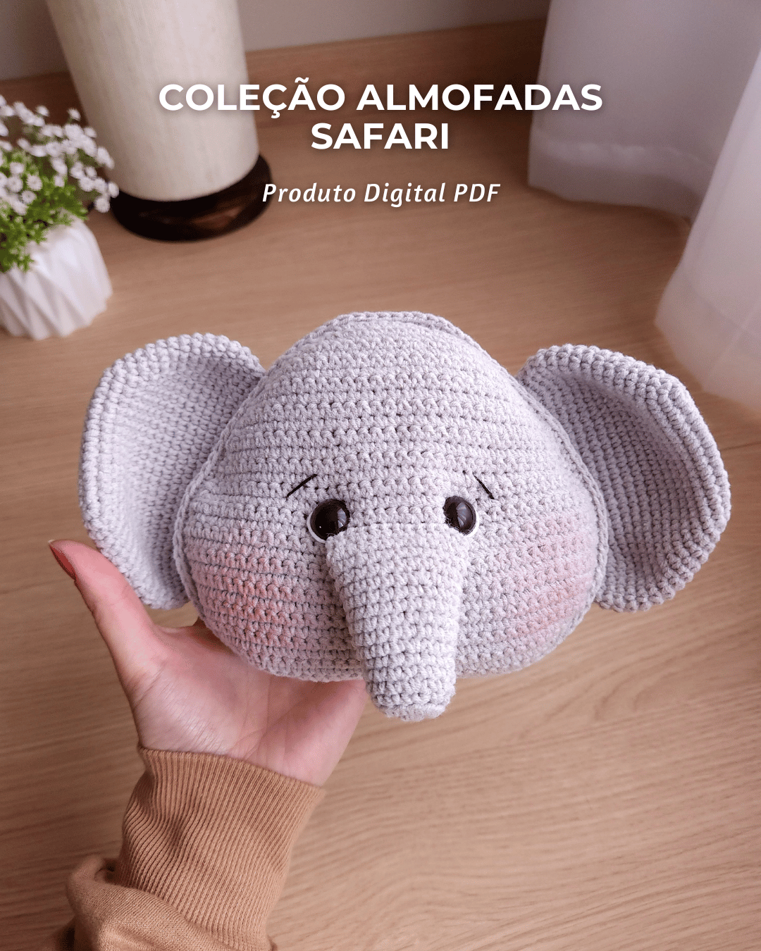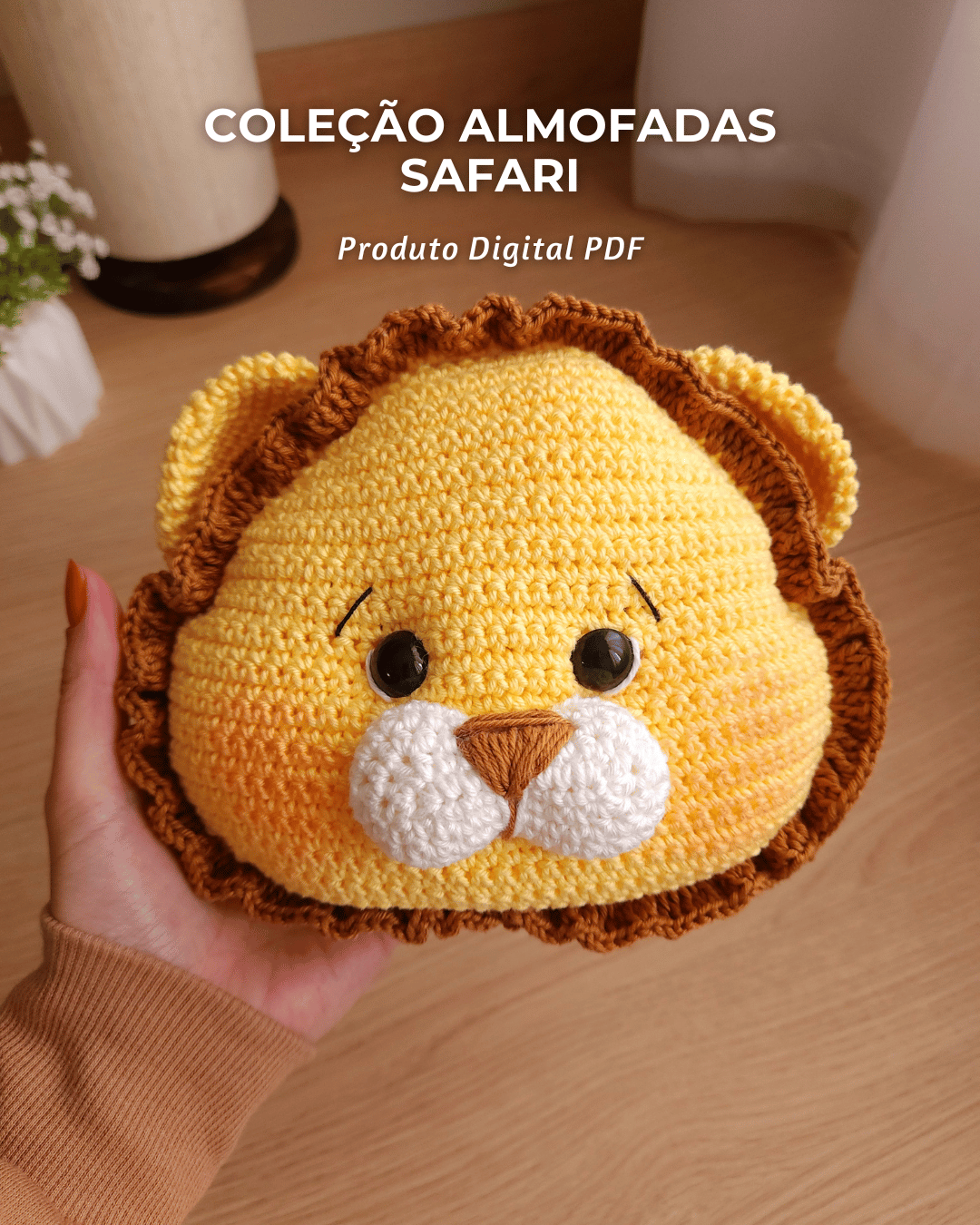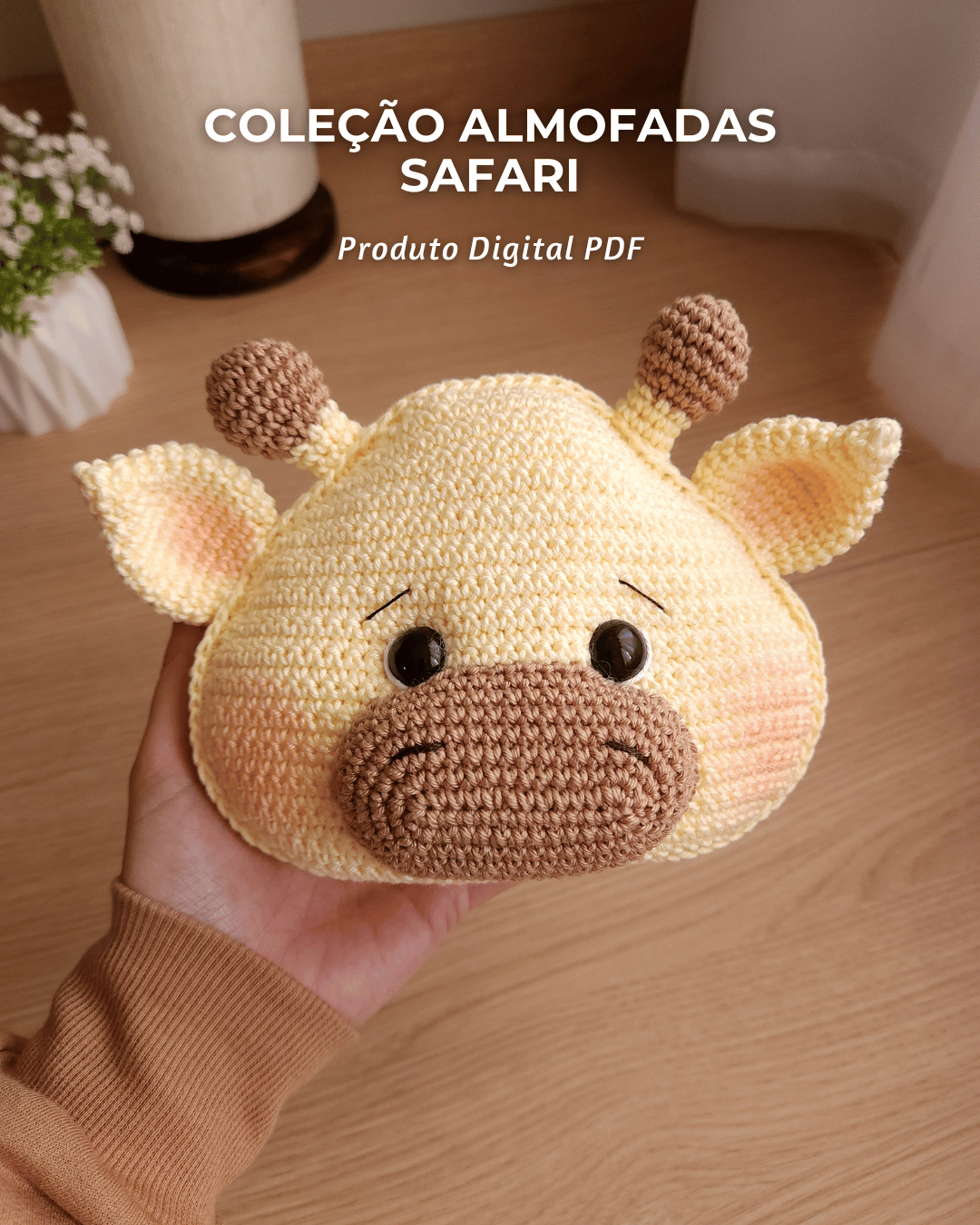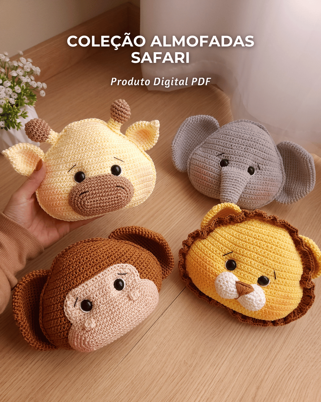 Você vai receber as receitas dos 4 modelos de almofadas: Leão, Girafa, Elefante e Macaco, em formato digital PDF, com o passo a passo descrito para confecção do amigurumi, fotos e vídeos auxiliares (link de acesso aos vídeos dentro do PDF).